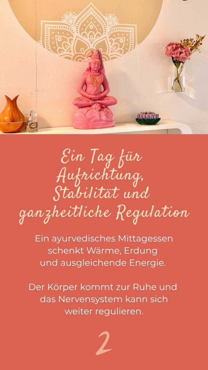 Darauf folgt ein ayurvedisches Mittagessen, das wärmend, nährend und ausgleichend wirkt. Die zuvor gewonnene Öffnung wird stabilisiert, der Körper kommt zur Ruhe und das Nervensystem kann weiter regulieren.
